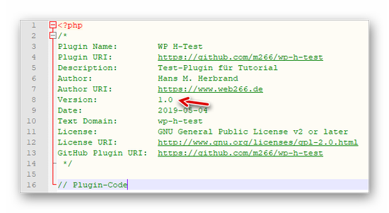 Wir öffnen die Plugin-Datei unseres Test-Plugins mit einem geeigneten Editor und sehen in der Zeile „Version“ den Eintrag „1.0“: