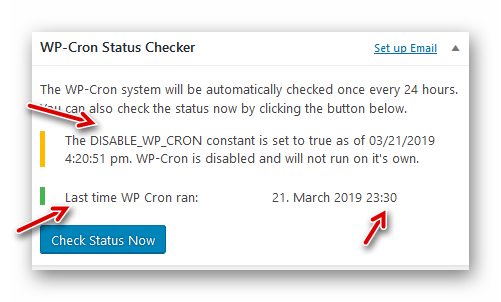 Nach der Umstellung auf einen echten Cronjob sollte die Wirkungsweise einige Zeit überprüft werden. Dazu eignet sich z. B. das Plugin “WP-Cron Status Checker“.