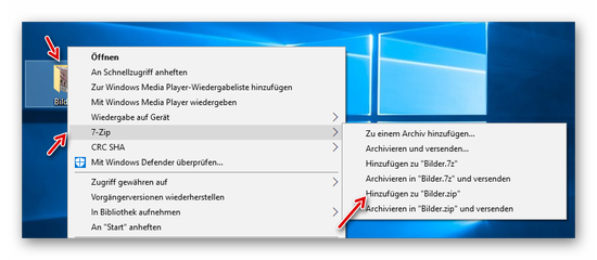 Wir klicken den gewählten Ordner (hier im Beispiel “Bilder”) mit rechter Maustaste an und wählen dann 7-Zip -> Hinzufügen zu “Bilder.zip” aus: