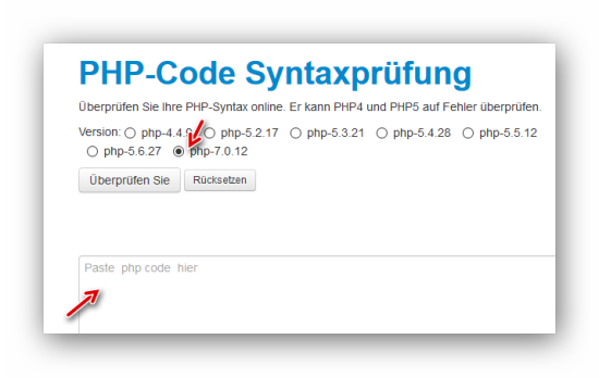 Nach dem Aufruf der URL wählen wir die höchste PHP-Version aus und fügen in dem großen Feld darunter unseren PHP-Code ein: