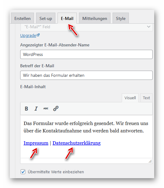 Das Muster-Formular muss noch an die eigene Website angepasst werden. Dazu sind die jeweiligen E-Mail-Adressen und URLs im Register „E-Mail“ des Formulars zu ändern. Der Platzhalter „#“ ist durch die eigenen Einträge zu ersetzen.