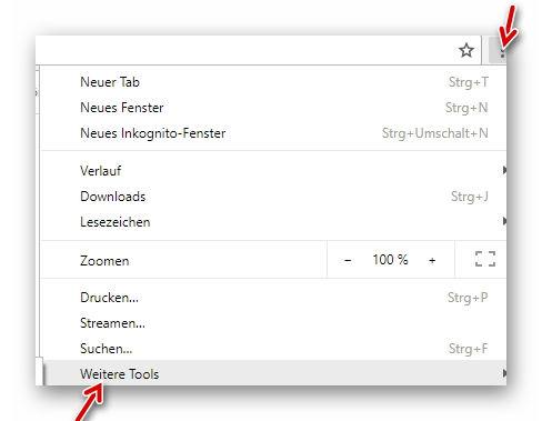Wir rufen in Chrome die zu überprüfende Website auf und klicken rechts oben auf die drei Punkte; dann auf weitere Tools: