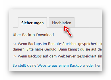Wir öffnen das Plugin WPvivid, klicken auf Sicherung & Wiederherstellung und rollen nach unten bis zum Tab “Hochladen”: