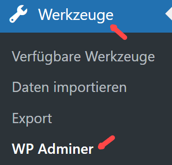 Wir klicken auf Werkzeuge -> WP Adminer…
